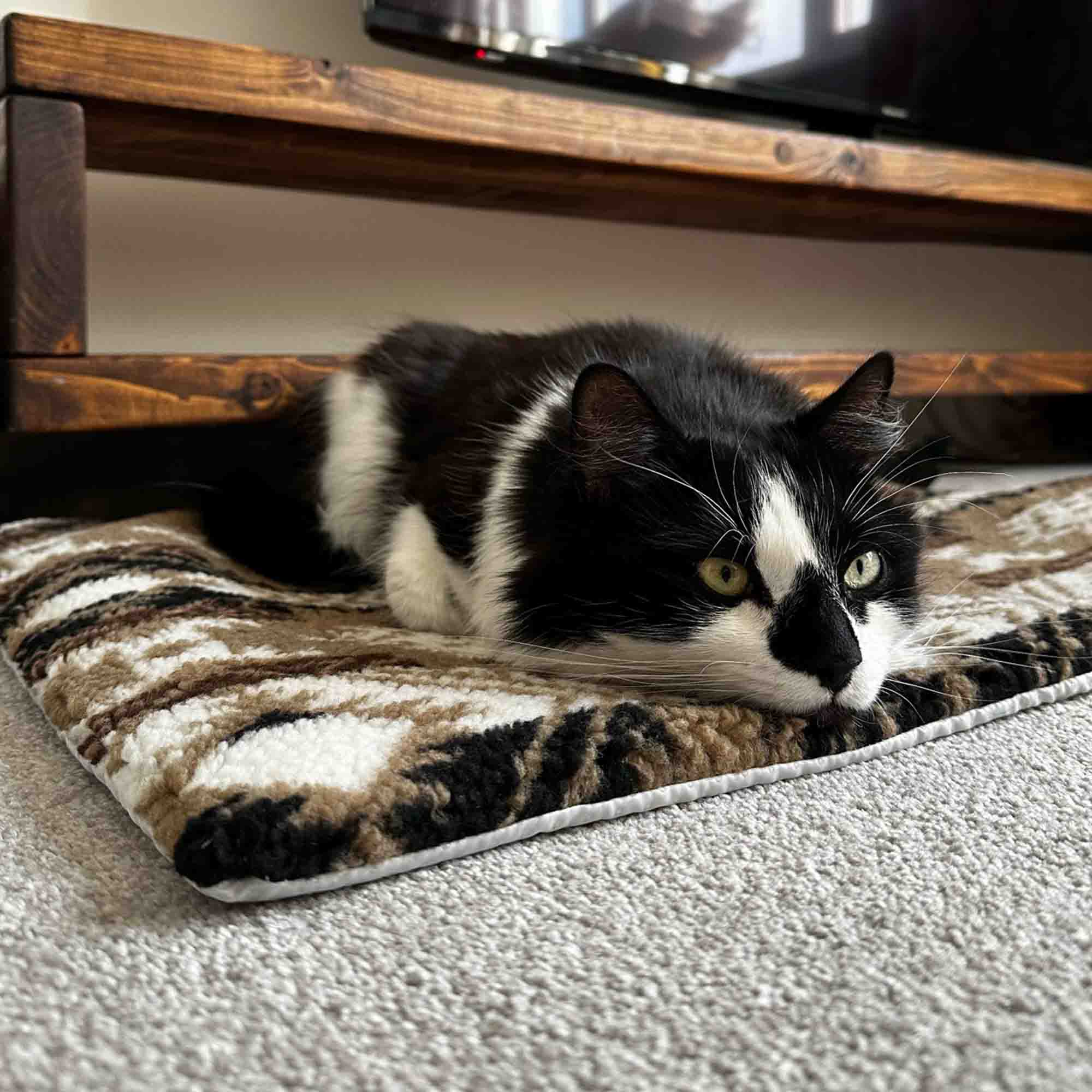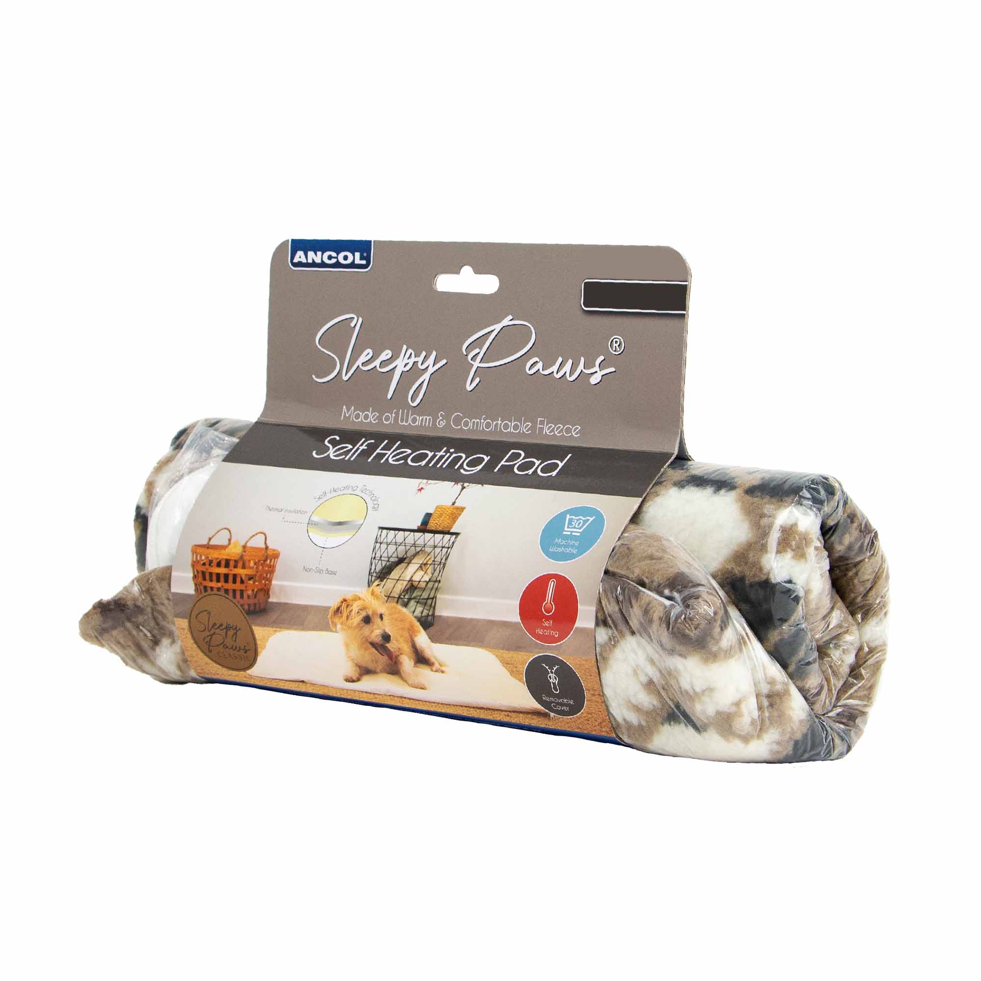 Pet pad with heat-reflecting core and lamb fleece style cover. Cover is removable and machine washable. This is the small pad and measures 48x36cm. This product is supplied in a cardboard wrap.