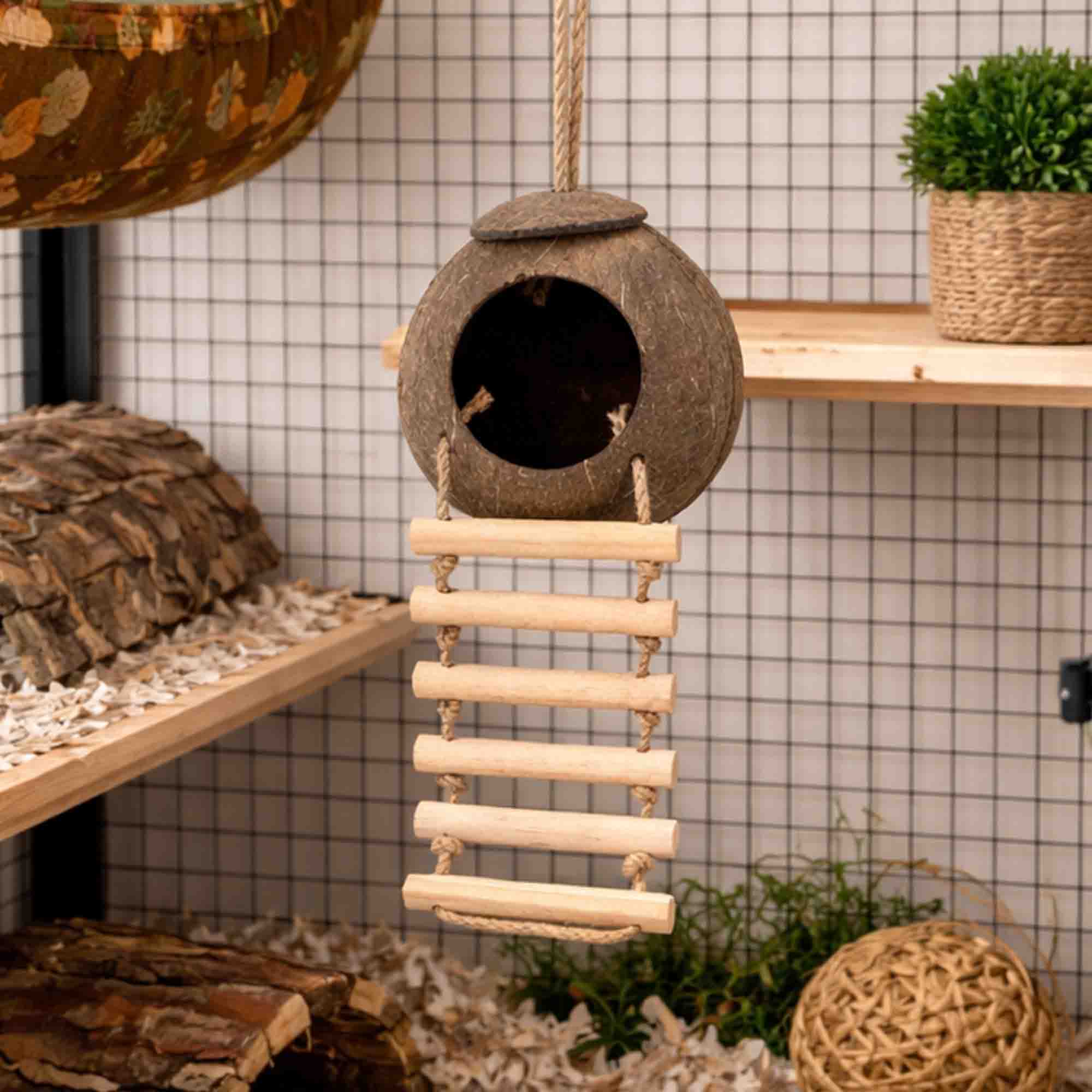 Crafted from natural coconut shell, this hideout provides a safe, snug, and chew-friendly shelter for a variety of small animals. The attached ladder adds an extra element of fun, encouraging climbing and exploration to keep your pets active and engaged.